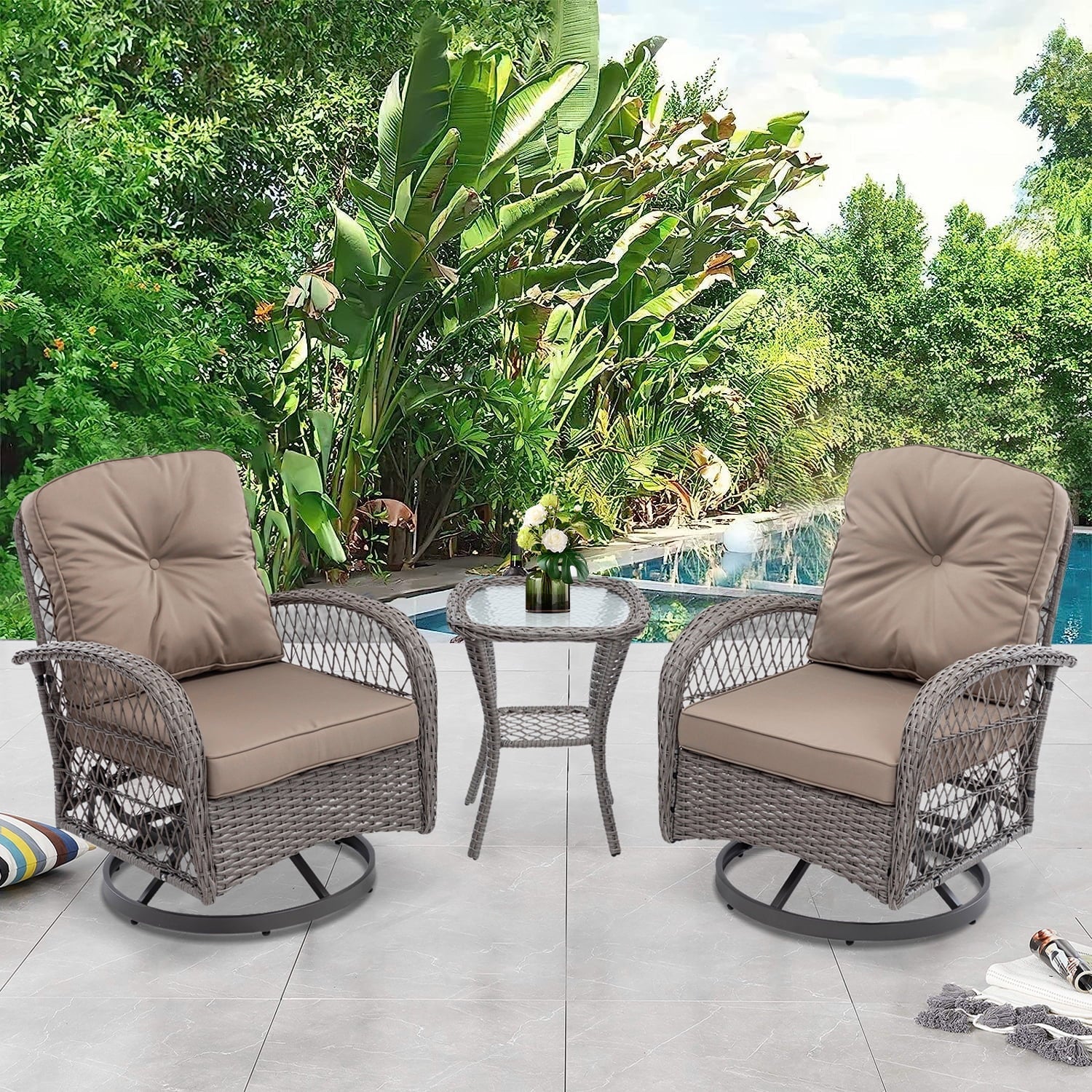 3-Piece Patio Bistro Furniture Set, 360° Patio Rattan Wicker Swivel Rocking Chair Set with Thickened Cushions and Glass Coffee Table, 275 LBS, Khaki