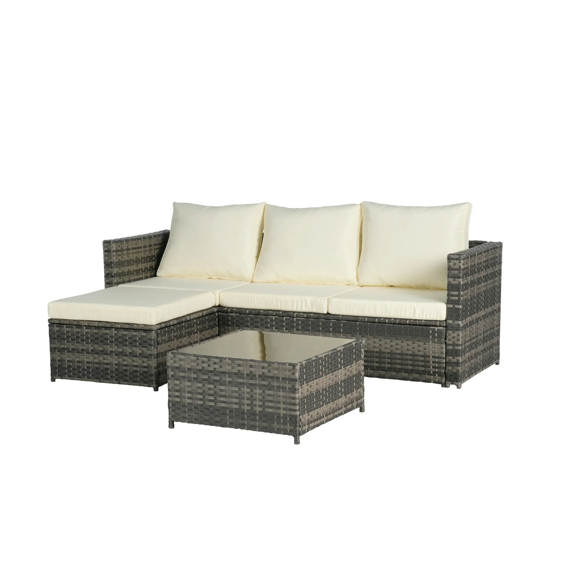 3 Piece Patio Furniture Set, All-Weather Outdoor Sectional Sofa Set, PE Rattan Conversation Set with Table & Cushions, Wicker Furniture Couch Set for Patio Deck Garden Poolside Yard, Beige