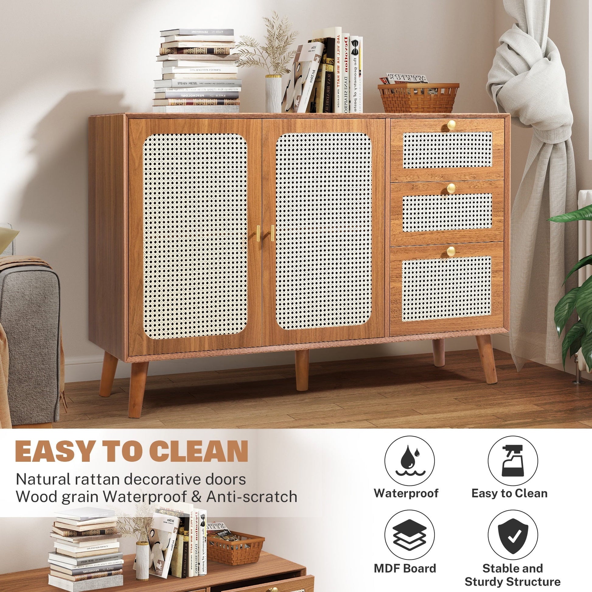 47" Rattan Buffet Sideboard with Storage, Segmart Storage Cabinet with 2 Doors and 3 Drawers, Farmhouse Coffee Bar Station Table, Modern Wood Cupboard for Kitchen, Livingroom and Dining Room