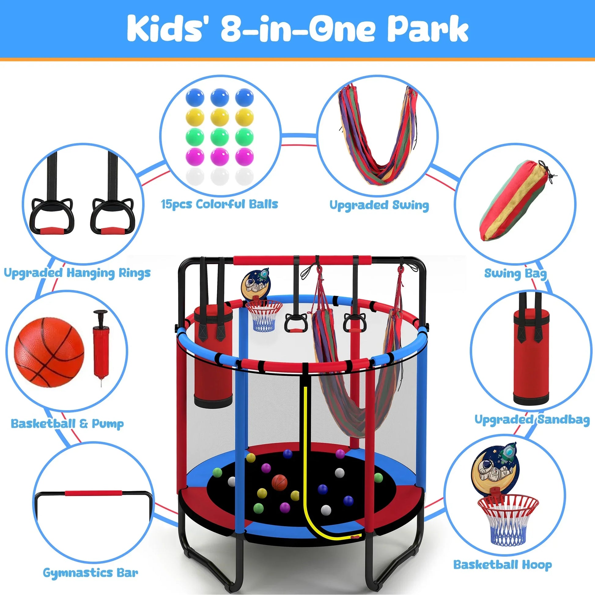 Mini Round Trampoline for Kids with Basketball Hoop, SEGMART 55'' Indoor Outdoor Toddler Trampoline with Enclosure Net, Swing, Sandbag, Ring, Ocean Balls, Small Trampoline Gift for Boys Girls, Blue