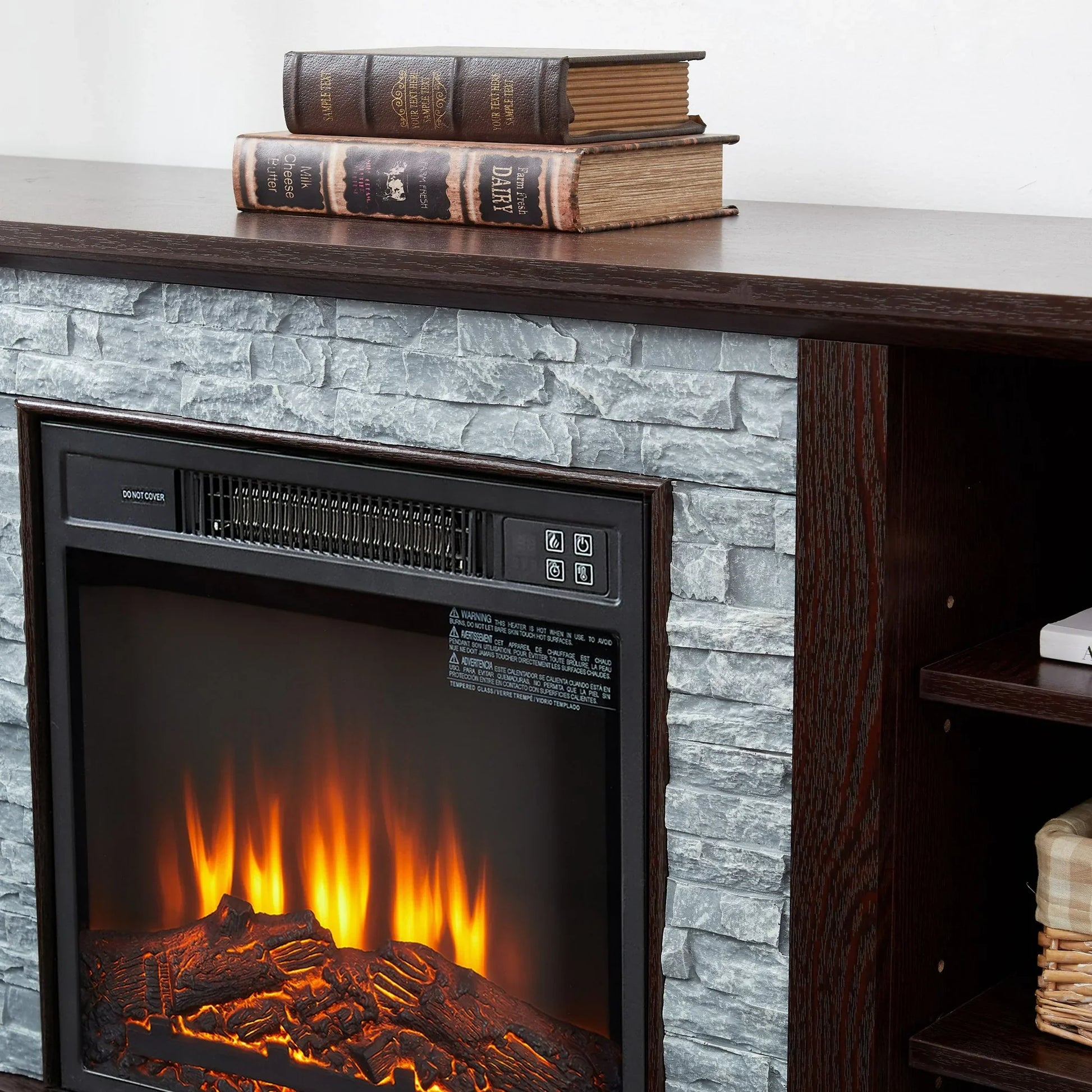 Sesslife Electric Fireplace TV Stand for 65" TVs, Farmhouse TV Console Table with Faux Stacked Stone Surrounded for Living Room, Wood Media Entertainment Center with Remote Control Fireplace, Cherry