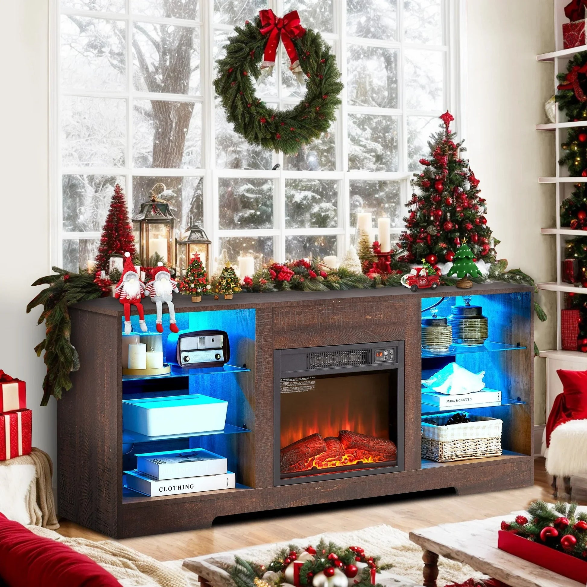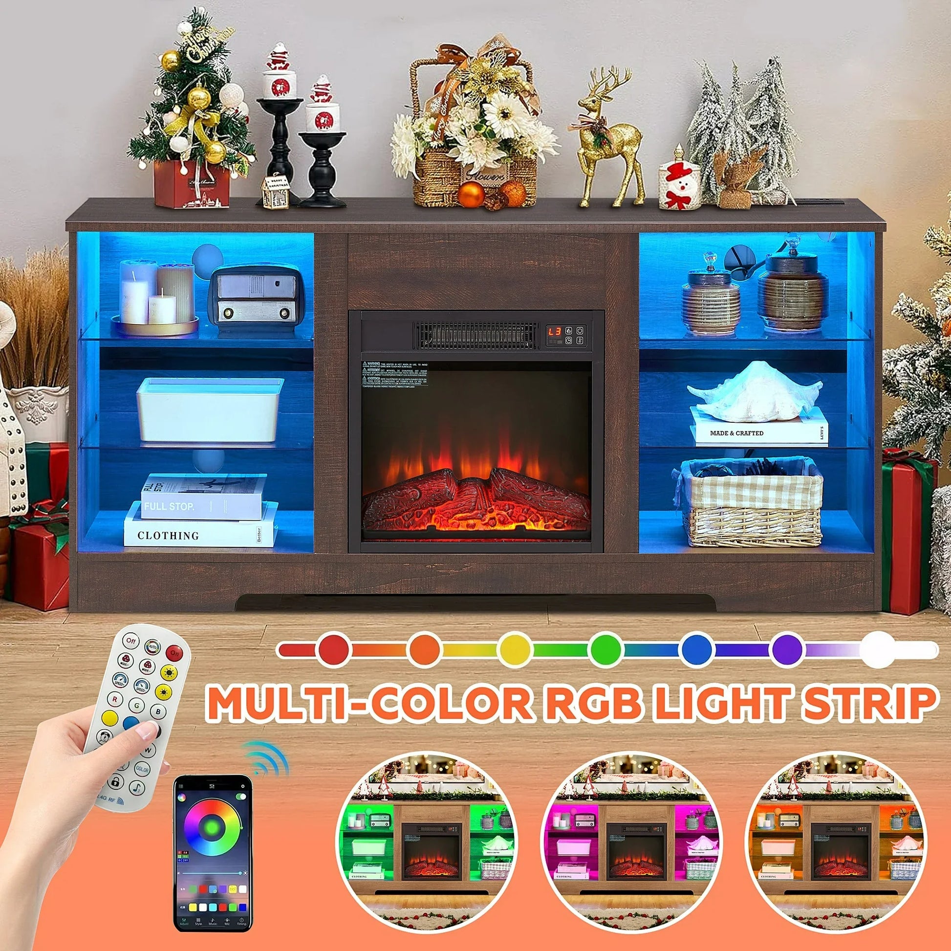 Sesslife Fireplace TV Stand with LED Light for 65 Inch TV, Farmhouse TV Console with Electric Fireplace, Console Entertainment Center Television Table with Charging Station for Living Room, Brown