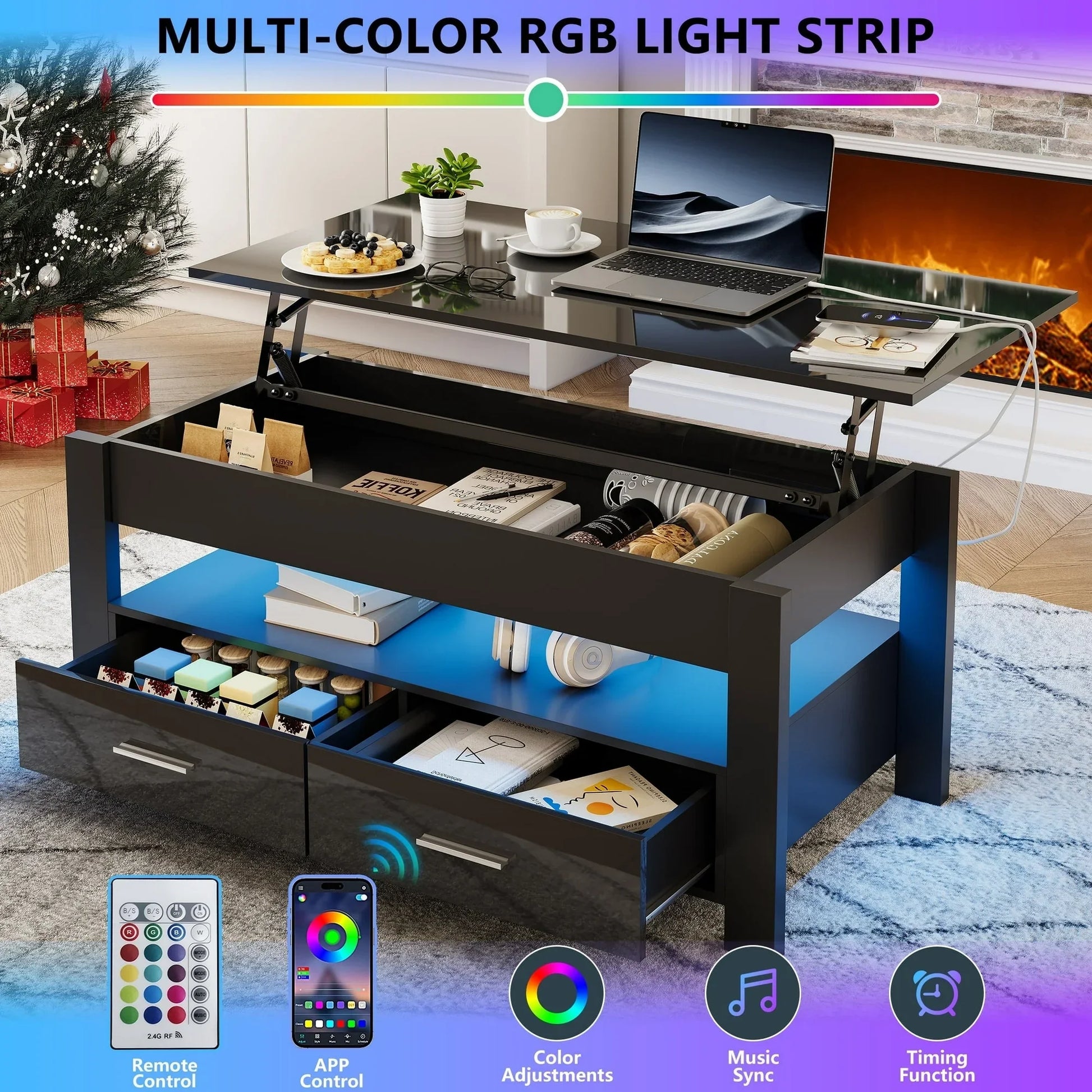 Sesslife Lift Top Coffee Table with Storage, LED Coffee Table with 2 Drawers and Hidden Compartment, High Gloss Rectangular Modern Center Table with Charging Station for Living Room, Black