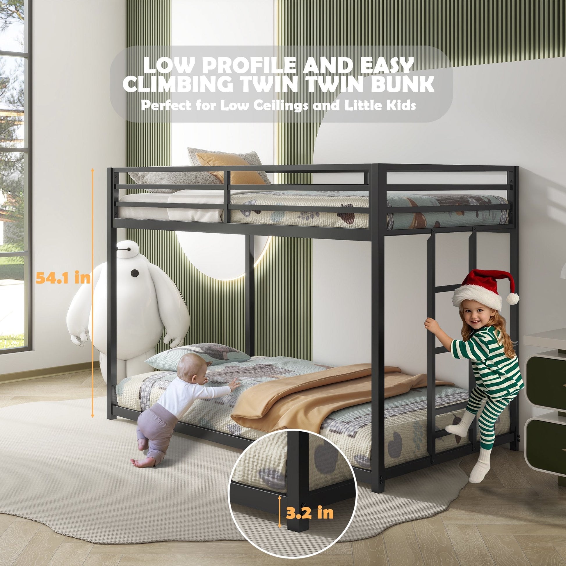 Sesslife Metal Twin Over Twin Bunk Beds, Heavy Duty Bed Frame with Ladder and Safety Full-Length Guardrails, Low Profile Junior Bunk Bed for Kids Teens Adults, Noise-Free, No Box Spring Needed, Black