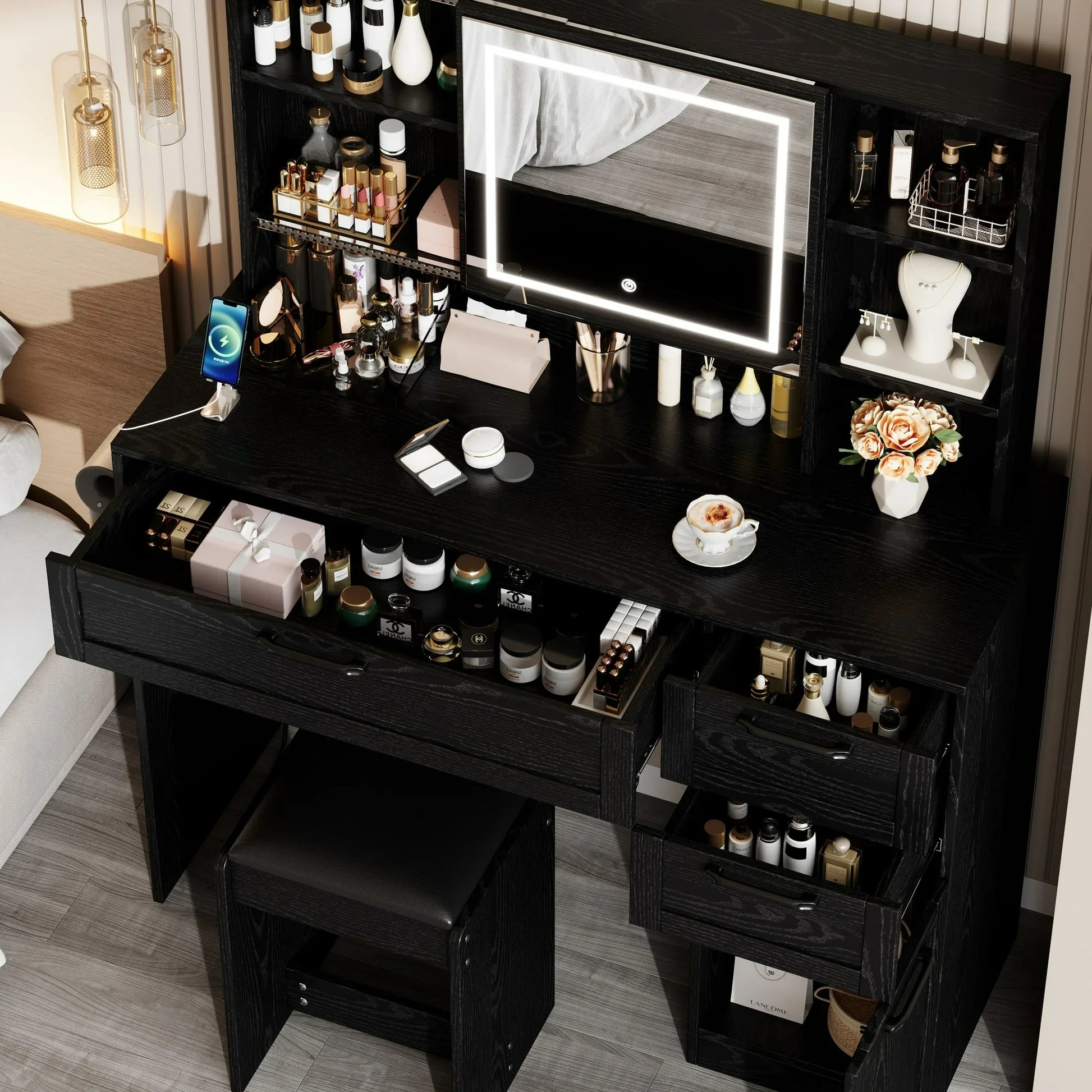Sesslife Vanity Set with Sliding LED Light Mirror, Black Makeup Desk with Cushioned Stool, Charging Station, Drawers, Storage Cabinet and Hair Dryer Rack, Modern Dressing Table Set for Women Girls