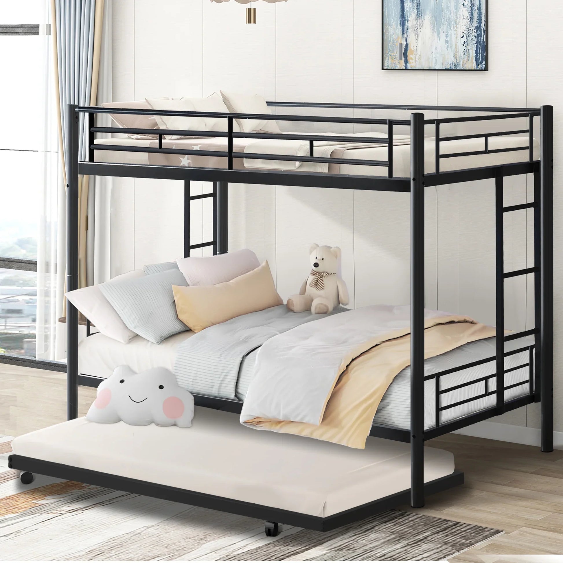 Twin Over Twin Bunk Bed with Trundle, Metal Twin Bed with Safety Guard Rail and Ladders, Space-Saving Design Sleeping Bedroom Bunk Bed for Boys, Girls, Kids, Young Teens and Adults, Easy Assembly, K92